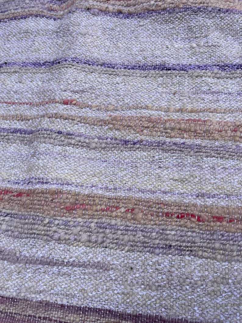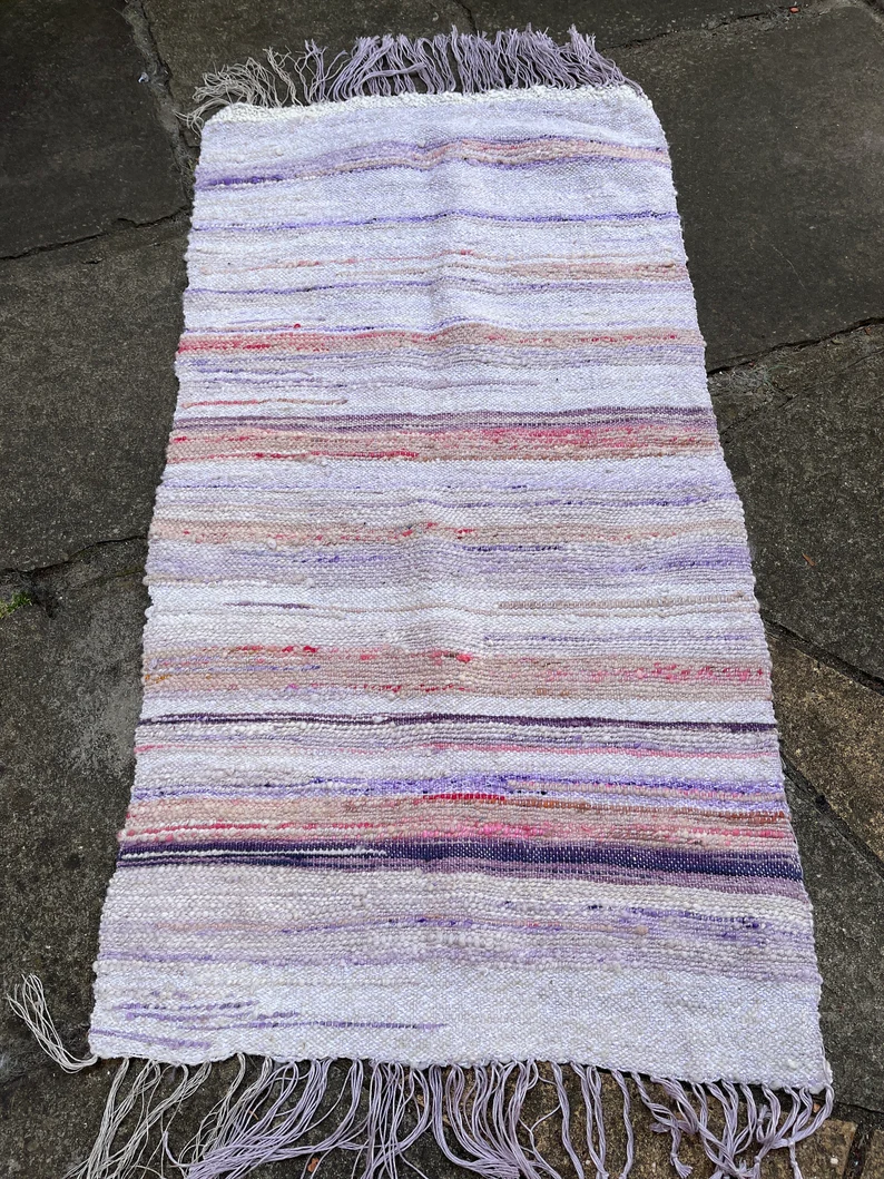 Produced from raw rarebreed UK fleece, this mat has been hand dyed and is a blend of pinks, purples creams and white The warp is a cotton / linen mix and the rest is wool which has been spun and then woven.