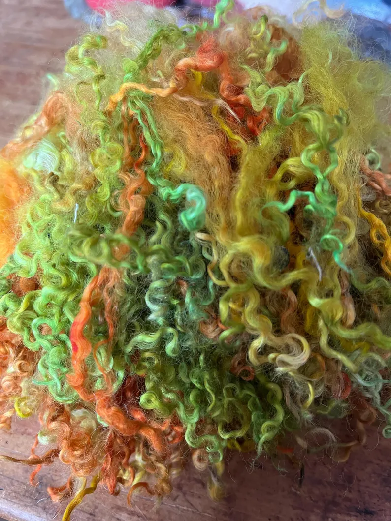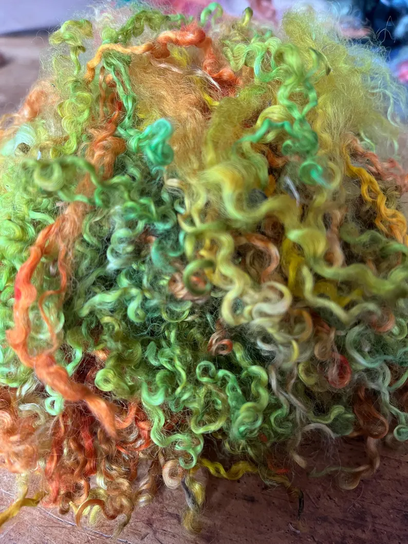 Approx 50g curls hand dyed in shades of fluorescent lemon, line and orange .