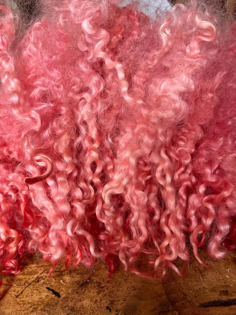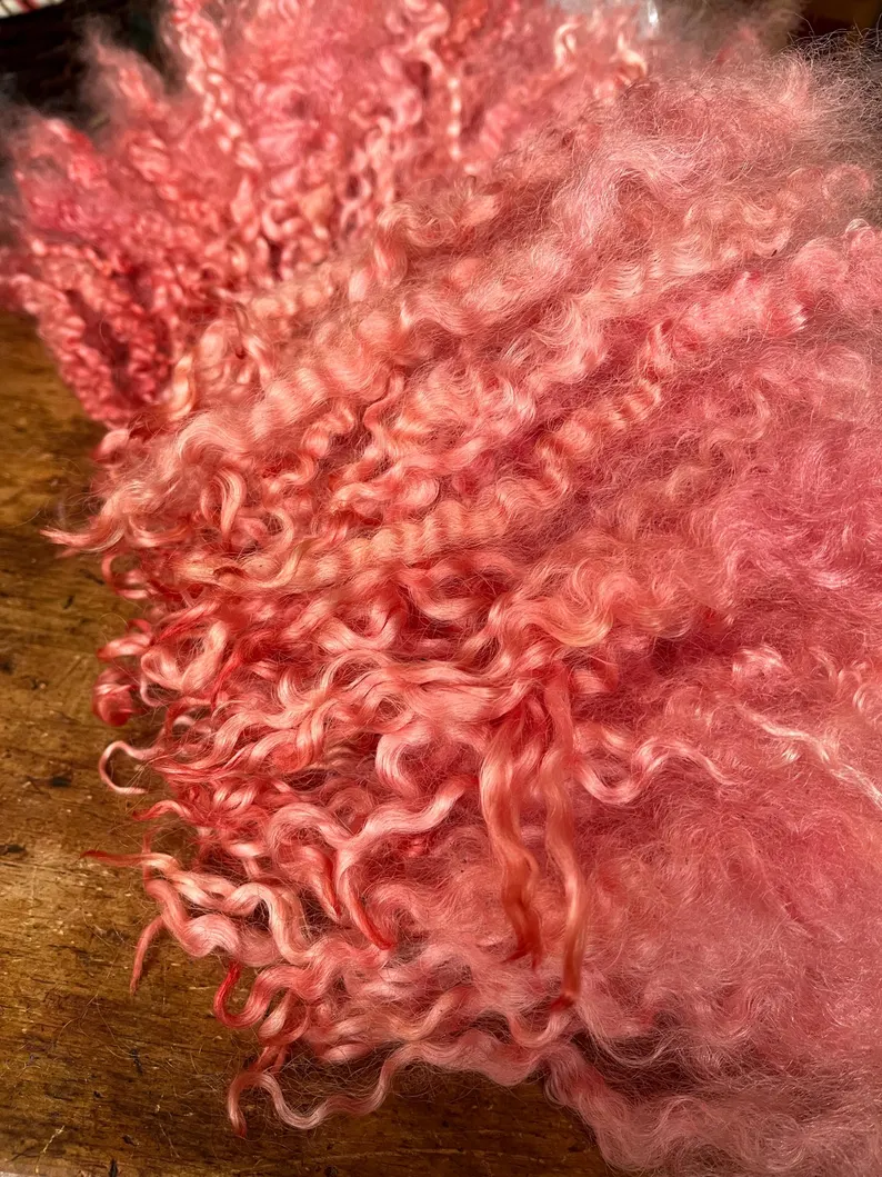 Approx 50g curls hand dyed in shades of pale pinks with a light peach glow.