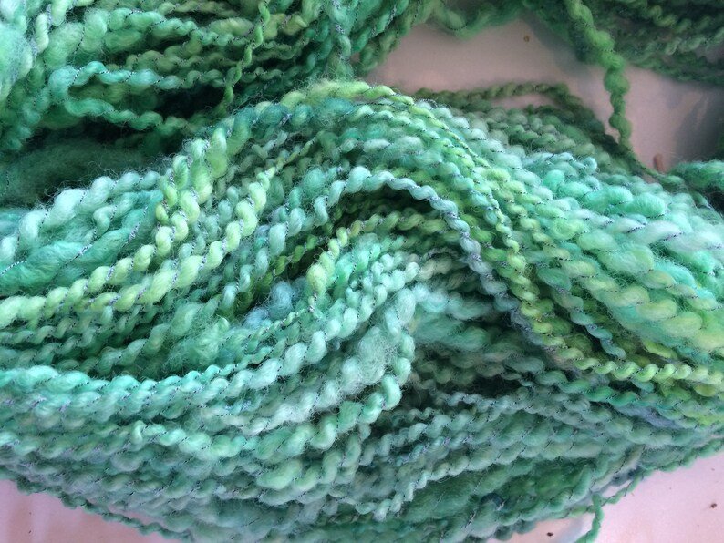 Hand washed, hand dyed hand spun from raw fleece in shades of spearmint and oak green. Plyed with a commercial cotton mix yarn. Soft and squidgy