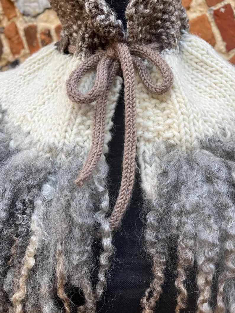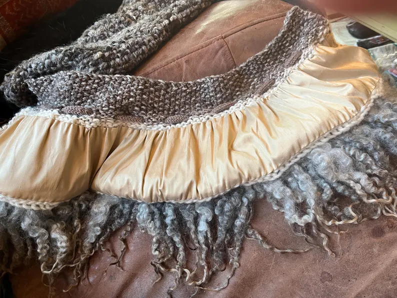 It is totally hand produced from raw fleece and knitted to include commercial yarn that is a wool mix. The cape is lined with a beautiful pale gold dupion silk fabric which has been stitched in by hand.