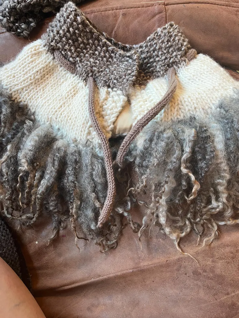 This collar is the first in a new range totally unique and bespoke to myself. It is hand knitted with beautiful naturally Colored rare breed locks. The locks are a Gotland cross Leicester longwool which is a totally new fusion and has the most beautiful long curls in a myriad of natural colours.