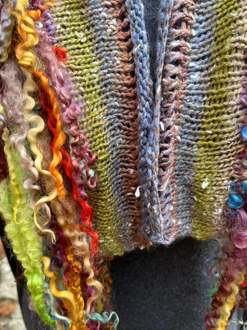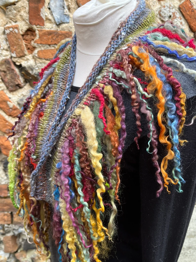 The curls are hand dyed Teeswater sheep curls that have been knitted into the scarf one by one. lined with a soft grey fabric.
