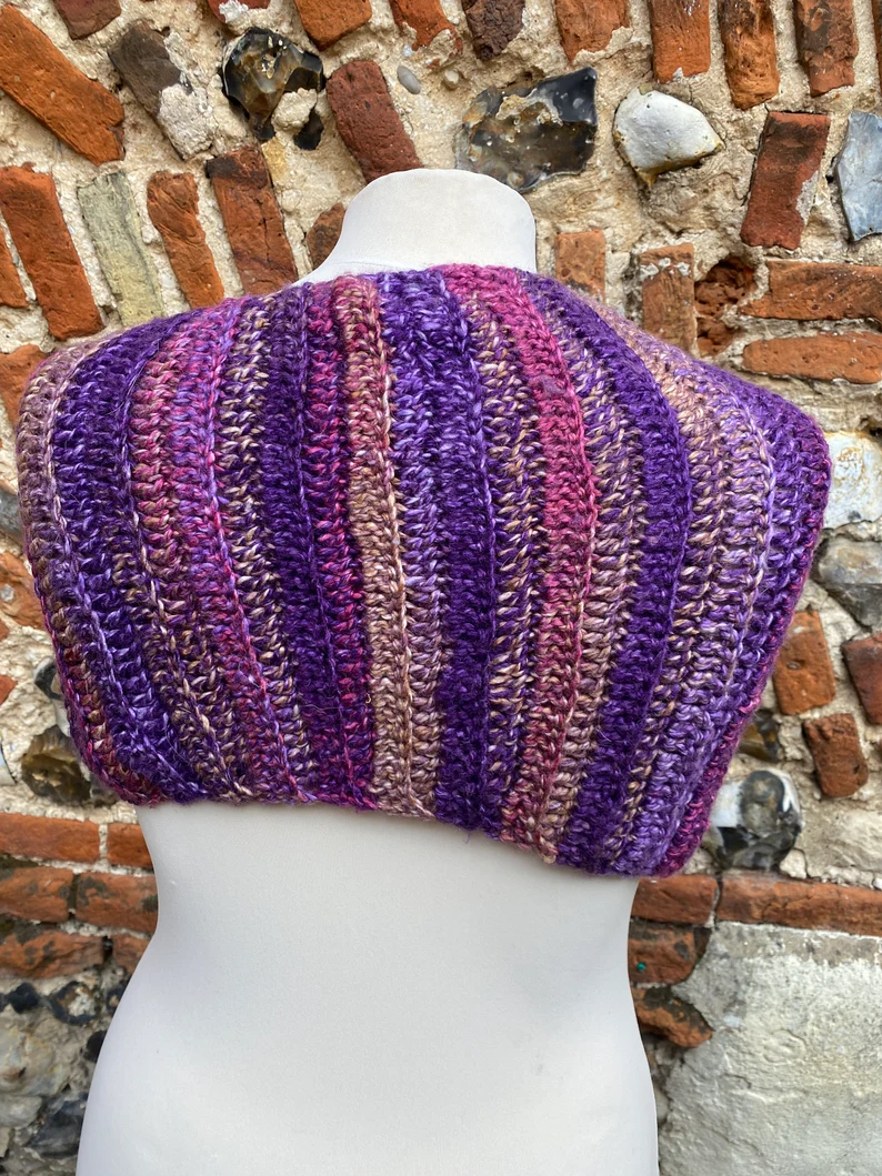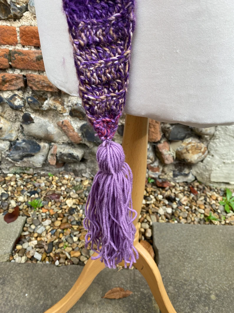 A pretty hand crocheted shawl with a wool/acrylic yarn called Chinese Violet. Edged with a pretty cream/white edging, with gaps to thread through the end of the shawl, which has a handmade tassel on the end.