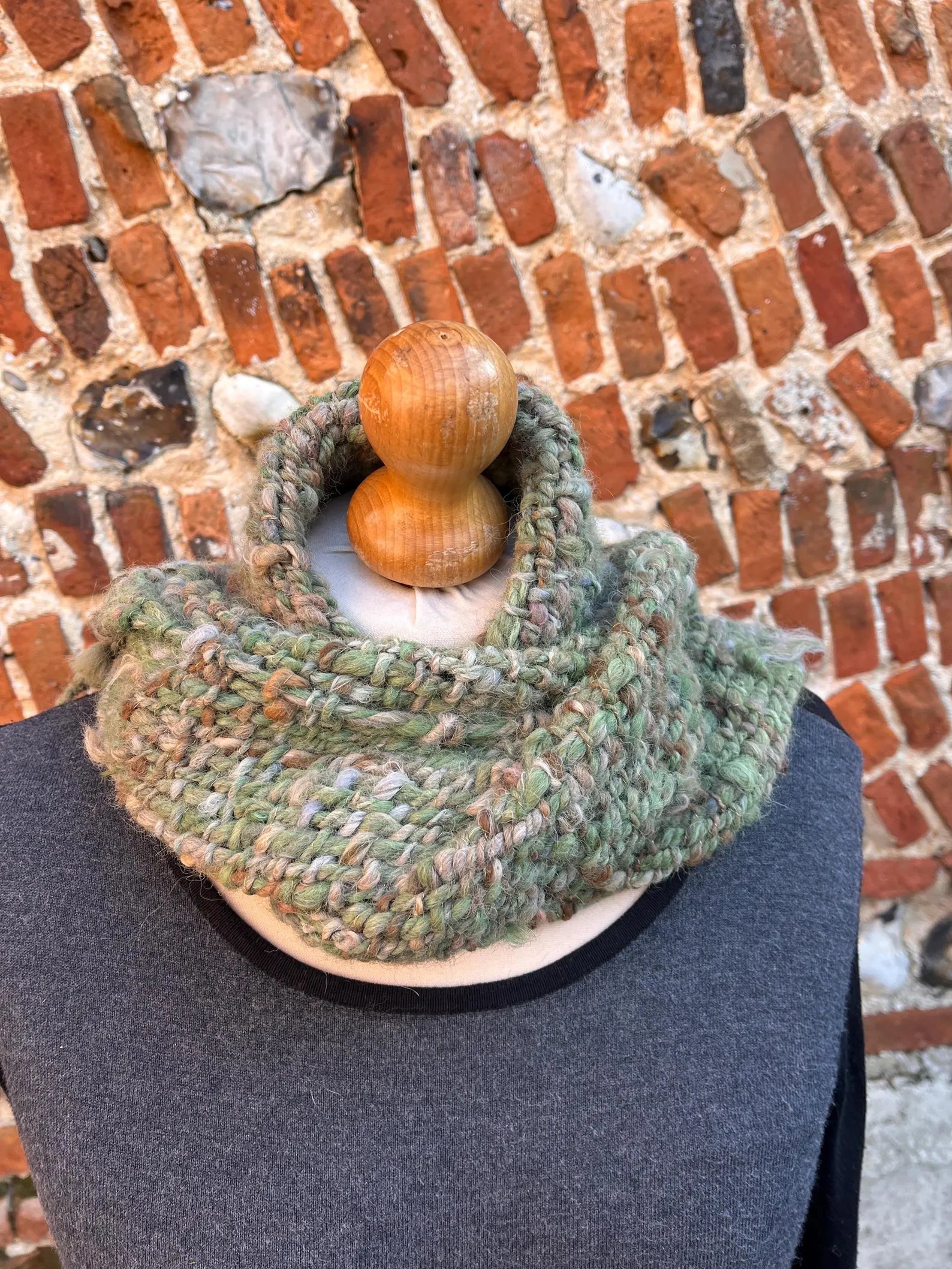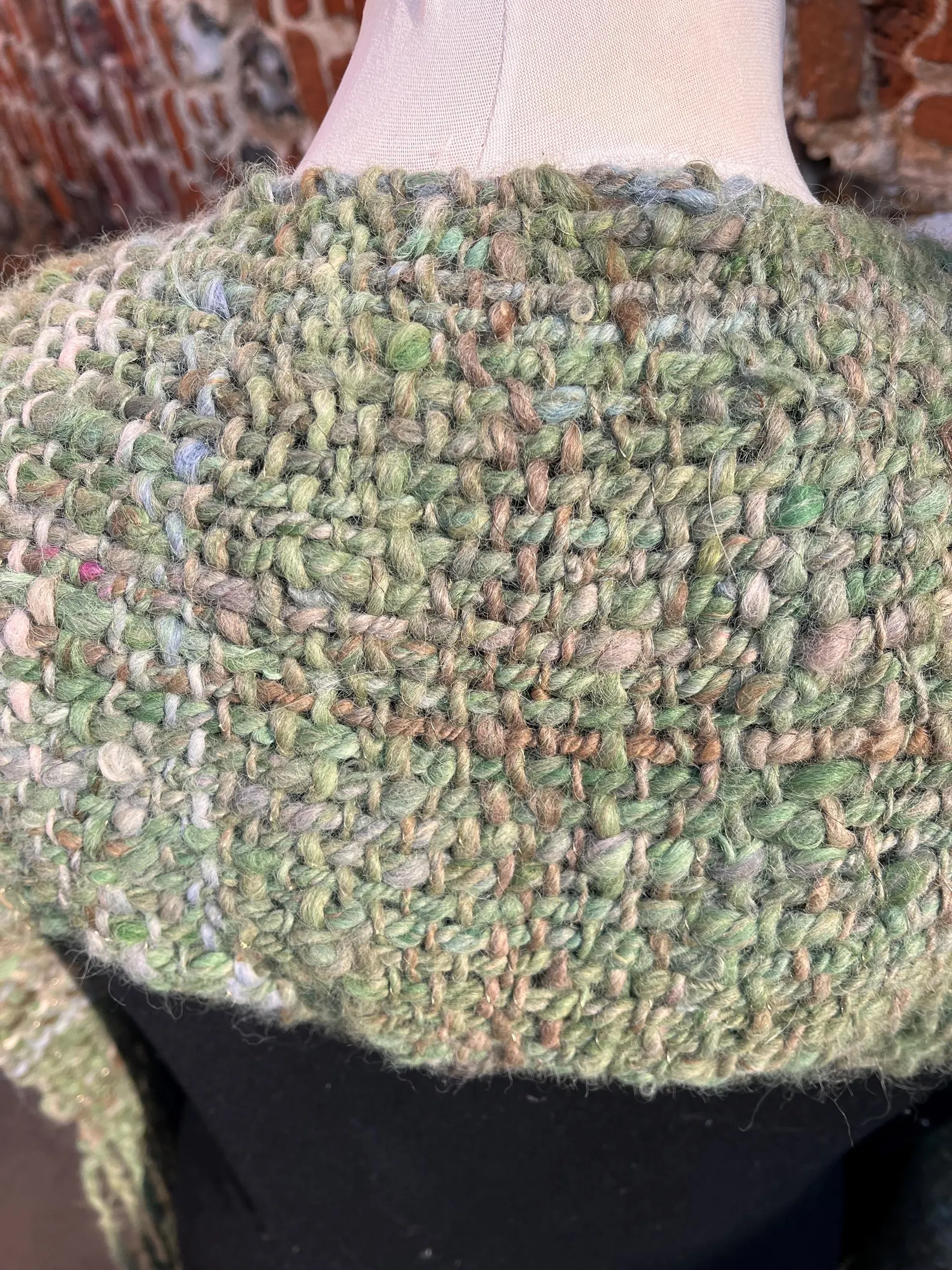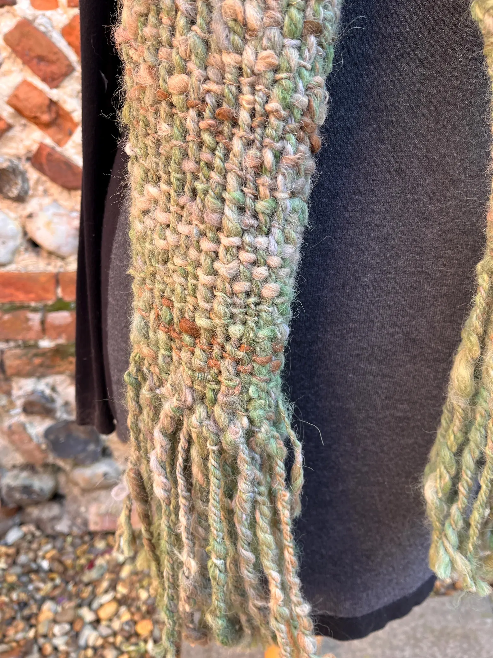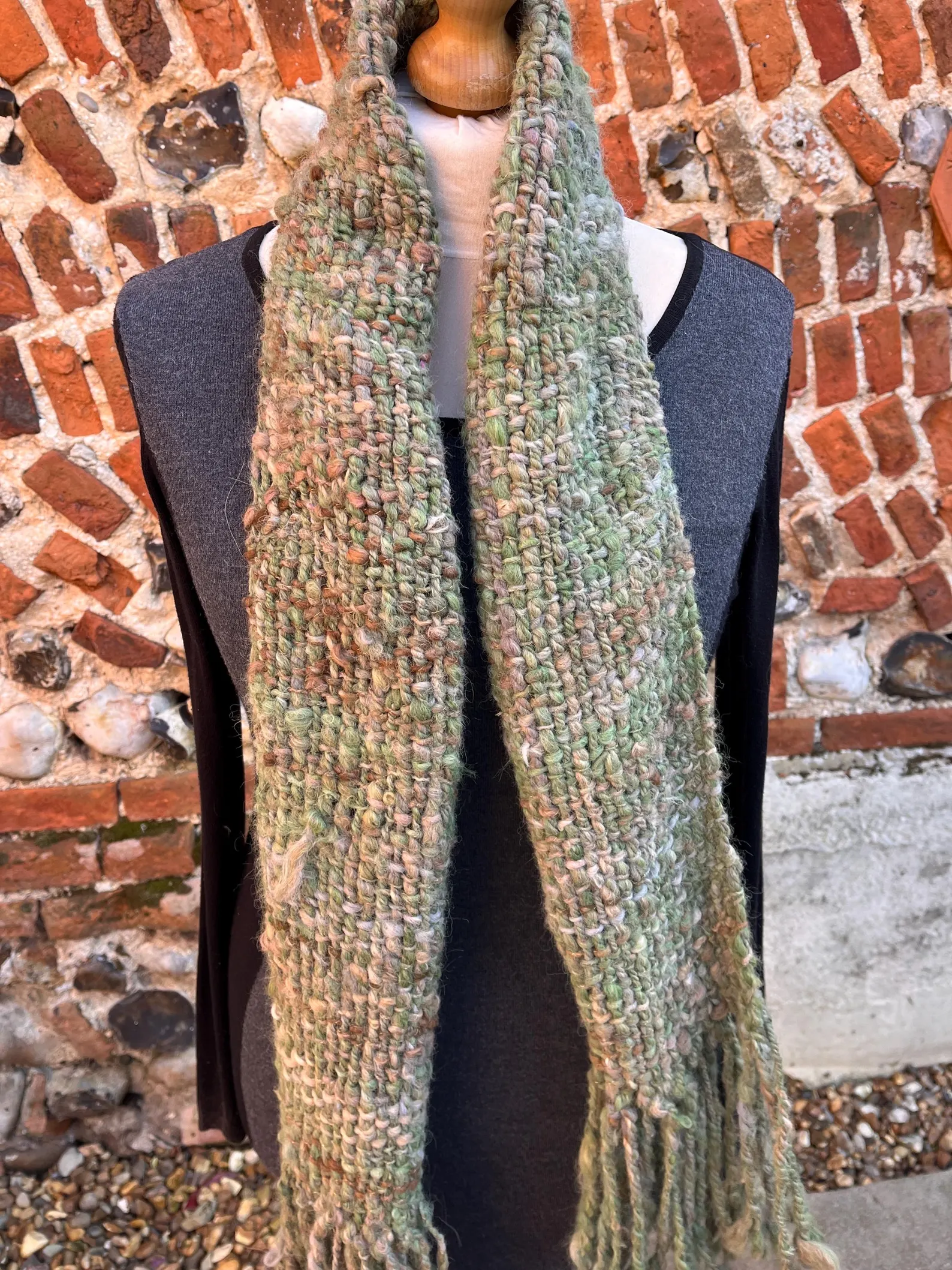 A completely unique and gorgeous hand made scarf – made from alpaca. Dyed in shades of green and a pale blue with undyed natural light fawn and creams. Plyed with a silver
