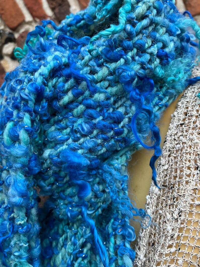 A completely unique and gorgeous hand made scarf – made from a UK ratebreed fleece blend with teeswater curls individually spun in then plyed with a silver thread.