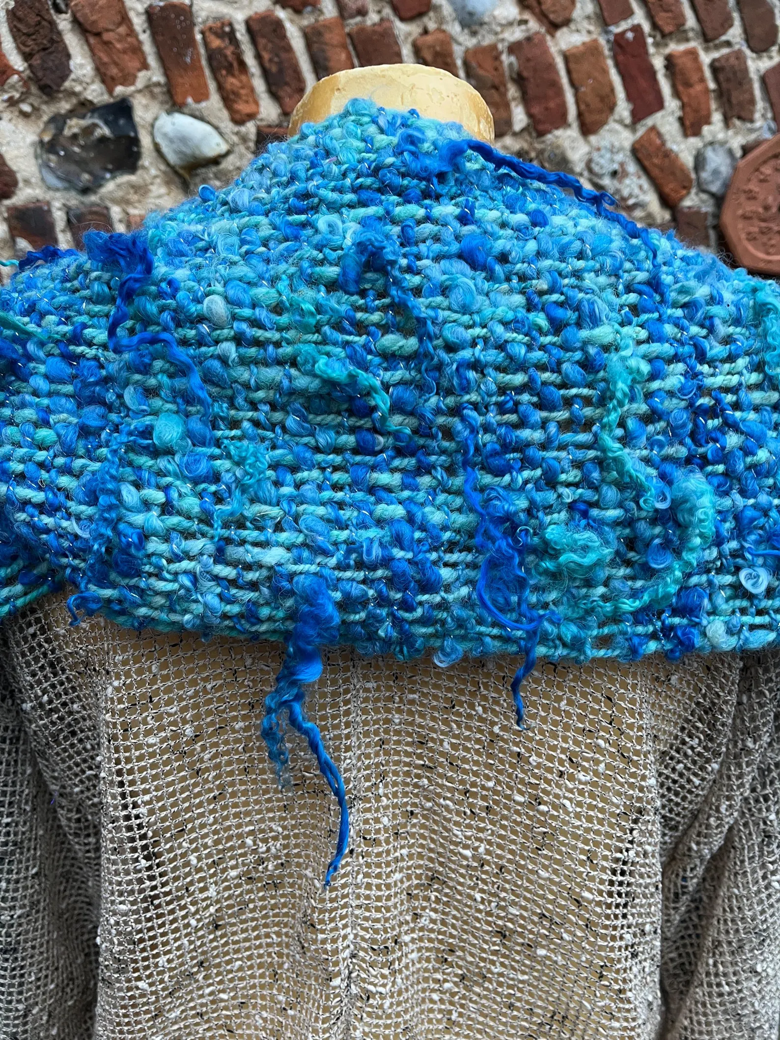 A completely unique and gorgeous hand made scarf – made from a UK ratebreed fleece blend with teeswater curls individually spun in then plyed with a silver thread.