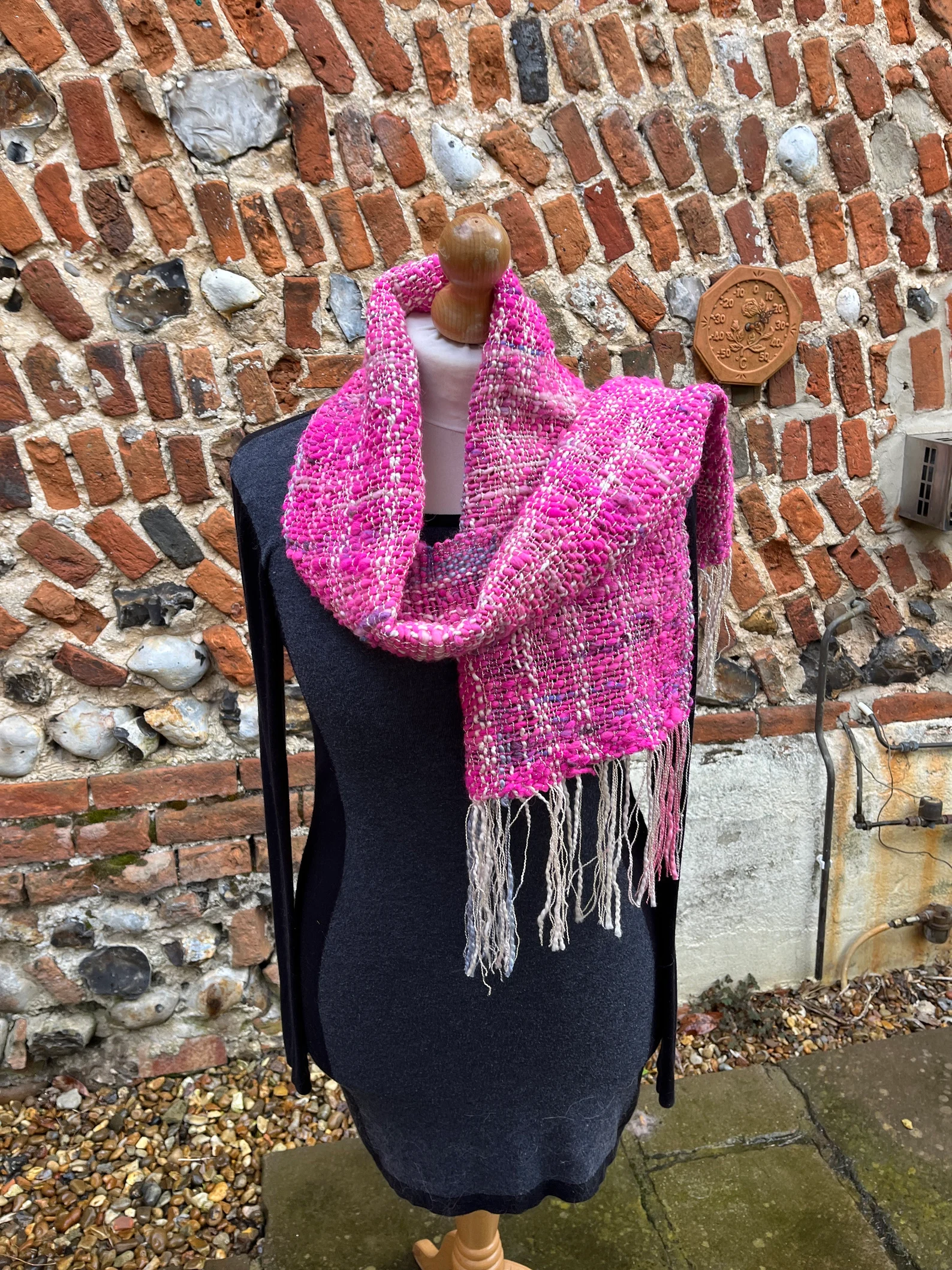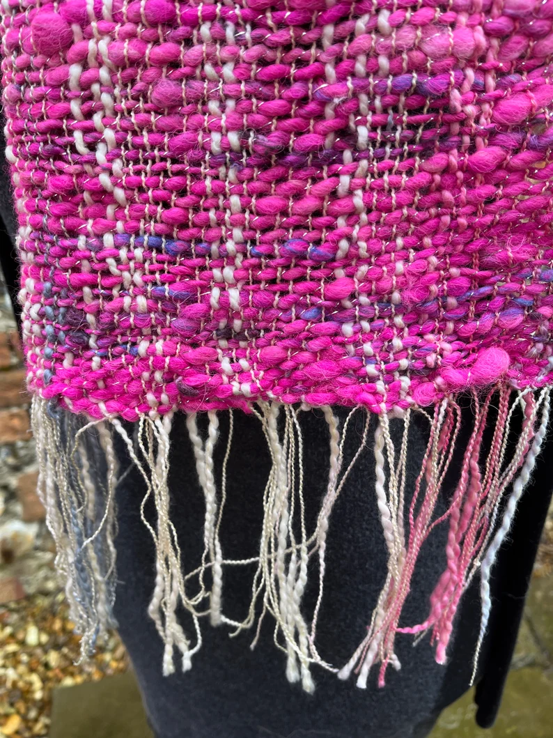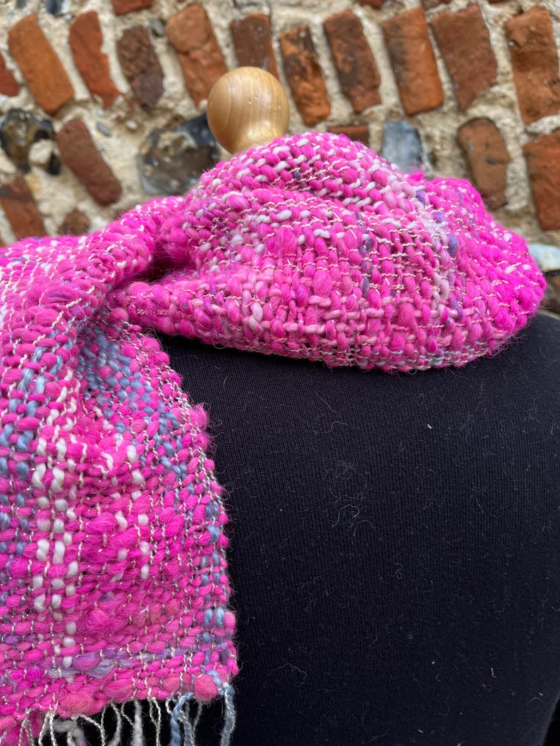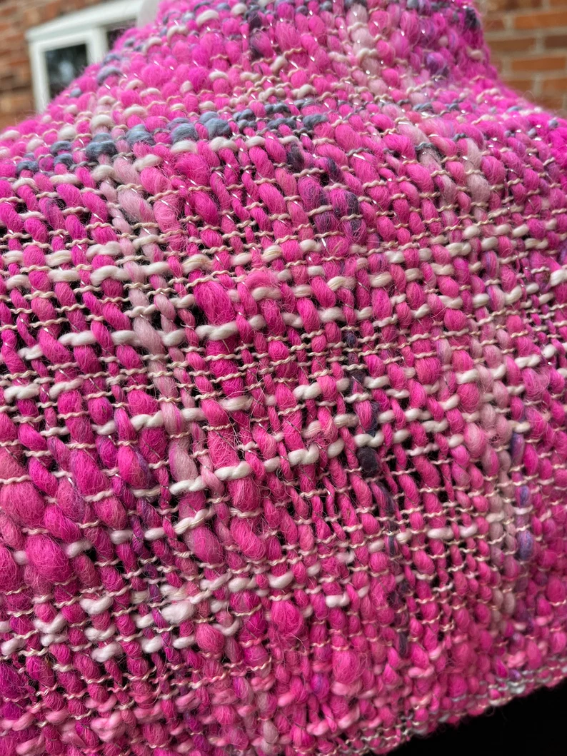 This piece is dyed in a vivid pink alpaca which is then Plyed with silver lurex thread.