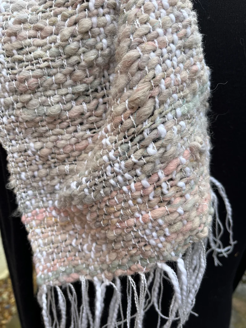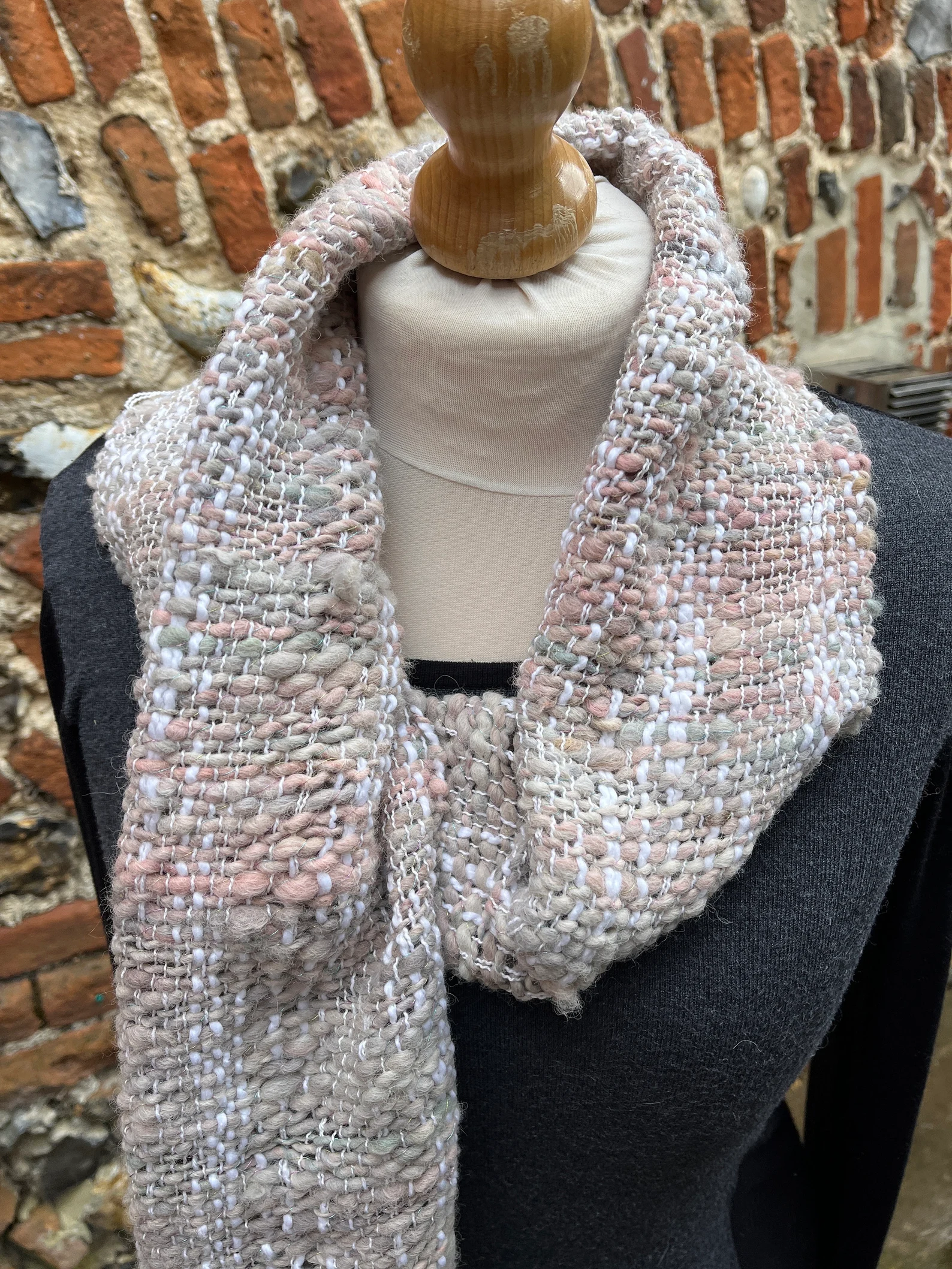 A completely unique and gorgeous hand made scarf – made from hand dyed alpaca and a variegated cotton mix warp,
