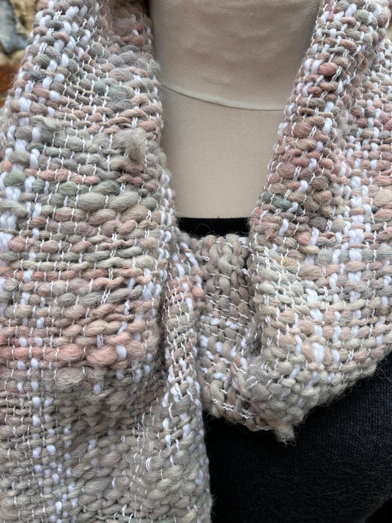 This piece is dyed in pastel shades of lightest pink, green and blue. alpaca which is then Plyed with silver lurex thread.