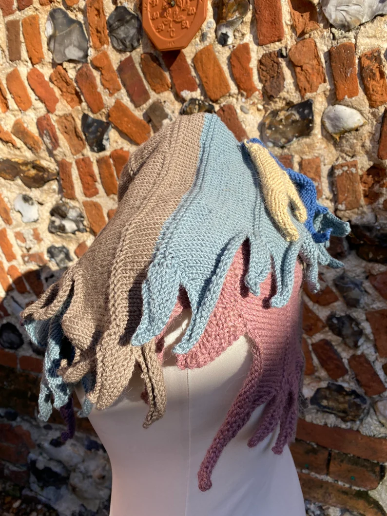 Knitted with a mixture of super soft commercial yarns of alpaca, baby alpaca and Merino wool in a selection of subtle blues greens and purples with a touch of dusky pink.