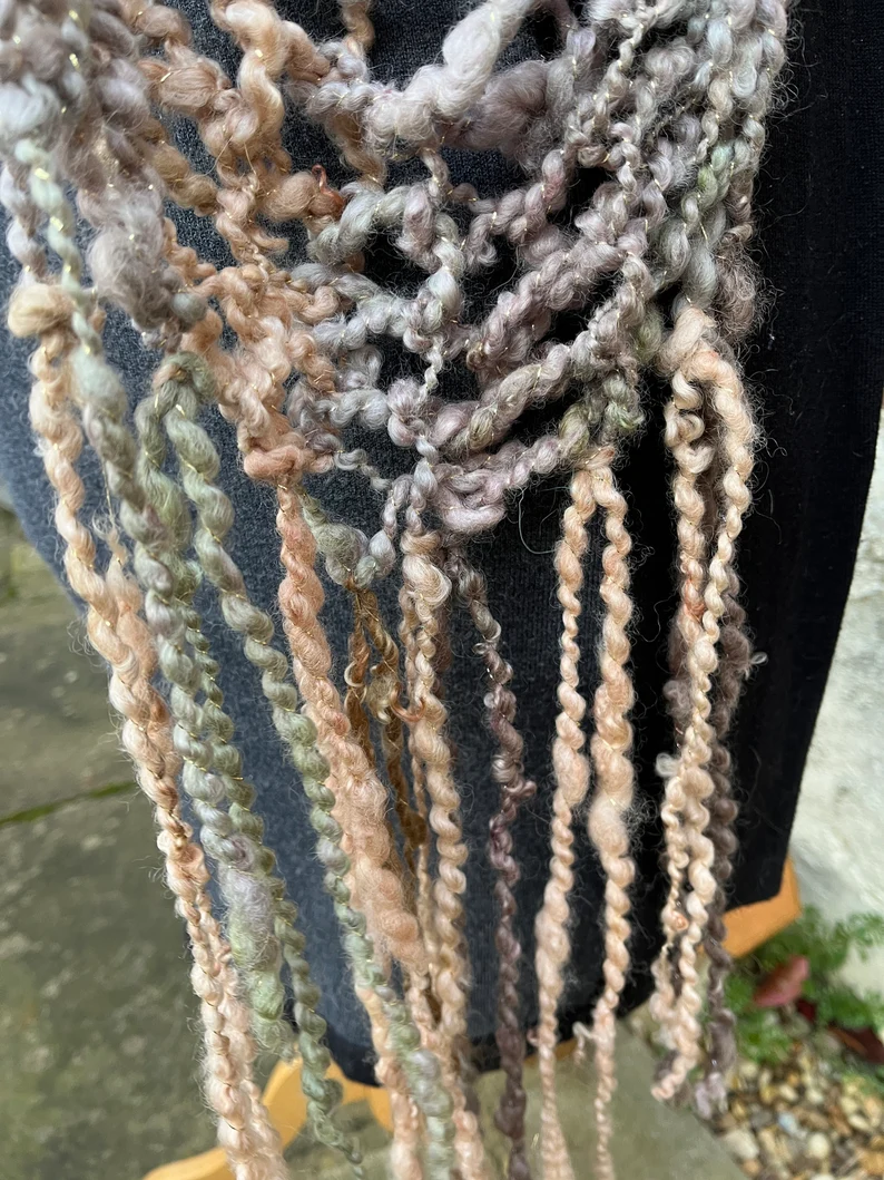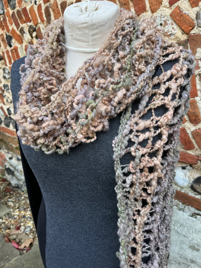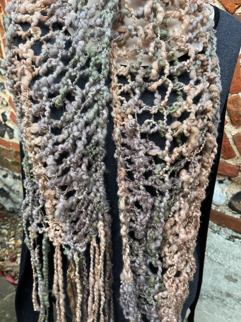 Hand knitted in a lovely loopy stitch. The whole scarf is over 80 inches excluding the very long fringes which are over 12 inches each end.