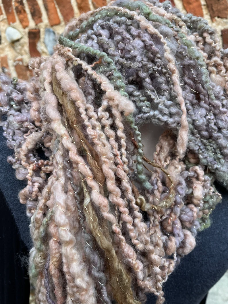 Produced from raw fleece. This is a beautifully soft yarn in subtle shades of peaches, fawn, sage, green, grey, and plied, with a beautiful gold thread.