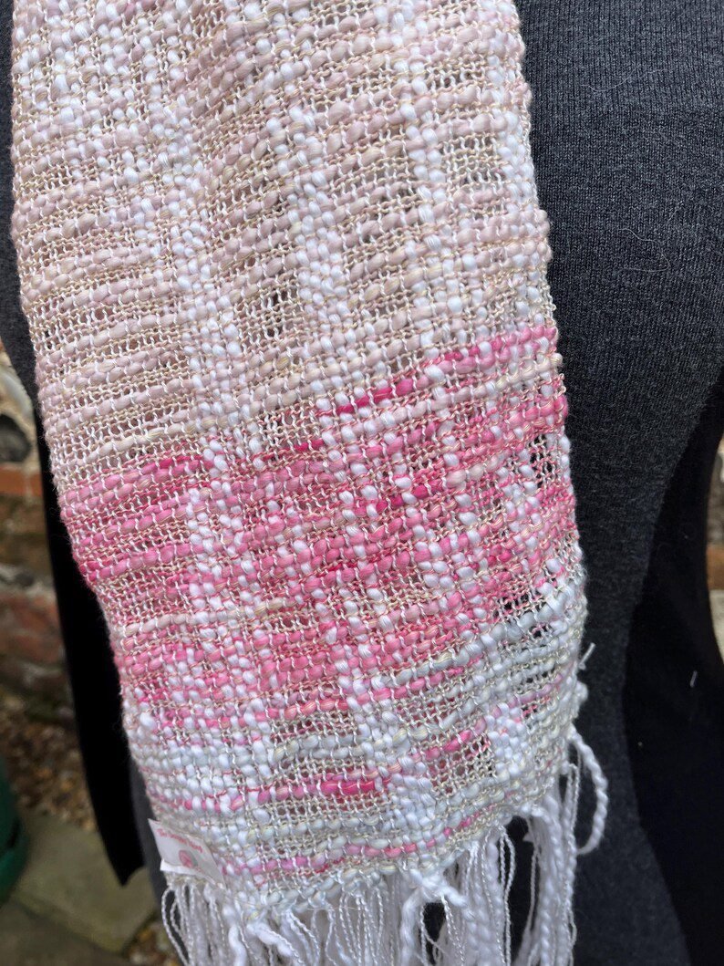 Hand woven – in shades of pinks, white and blue – a lovely loose and flowing piece that is perfect for spring and summer for keeping the chill of on alfresco evenings.