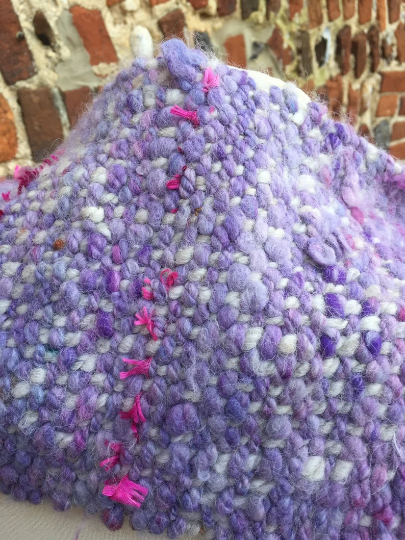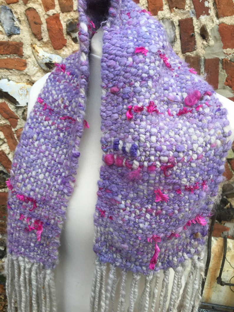 Hand dyed, spun and woven, this is a 98% alpaca scarf with a little vivid cerise eyelash yarn for a funky contrast to the subtle pale lilac and cream of the alpaca