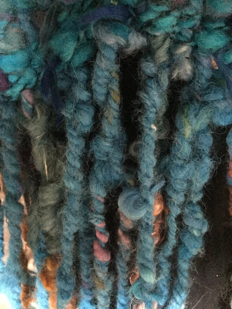 Stunning chunky teal blue hand woven scarf made with rarebreed fleece from uk shearing. Hand processed from raw fleece – the yarn was spun in the art yarn ethos and used in both directions of the weave. Along with some very pretty acrylic eyelash yarn for even more texture
