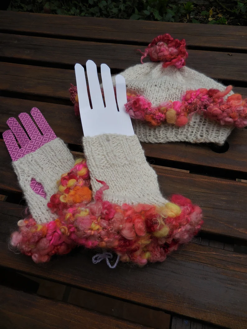 Matching handknitted hat and fingerless gloves