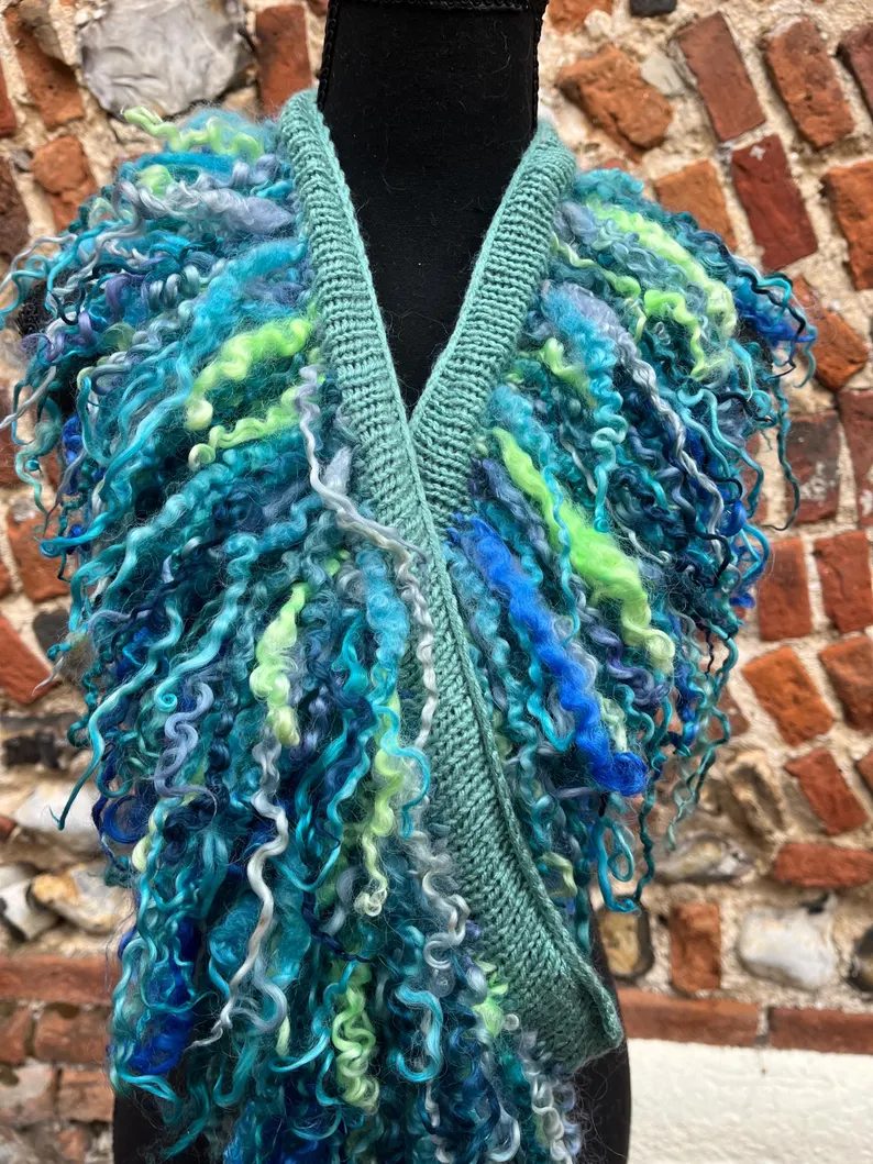 Hand knitted boa with dyed Teeswater locks in shades vibrant Azure blues, turquoise and light green.